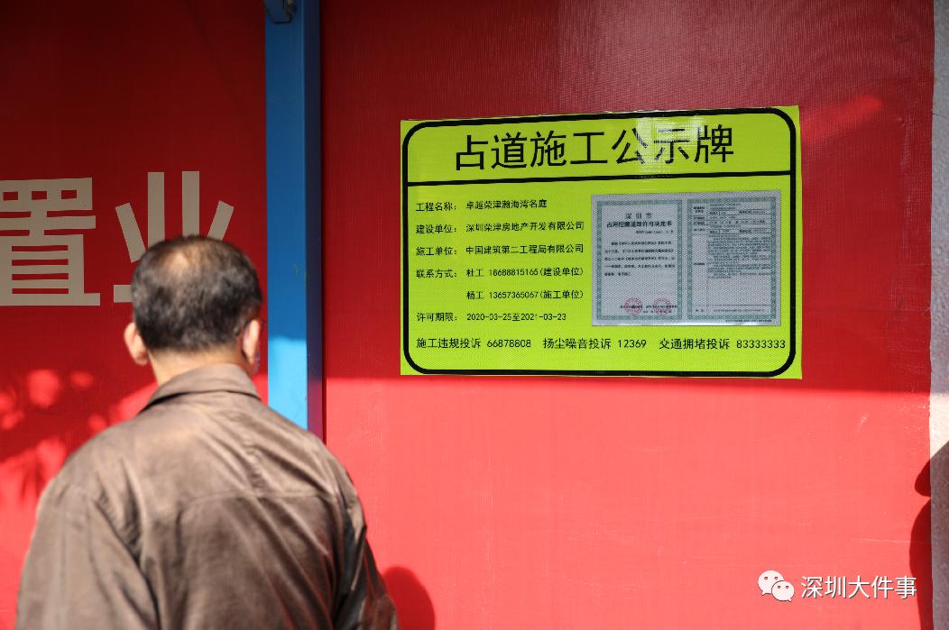 3月9日,我們?cè)邴}田區(qū)卓越榮津瀚海灣名庭施工現(xiàn)場(chǎng)看到,圍欄外每隔50米就張貼了最新版的占道施工公示牌,且在便于行人查閱的顯眼位置。