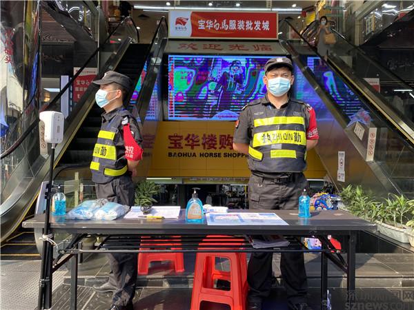 來(lái)到寶華樓門口,現(xiàn)場(chǎng)可見,出入口設(shè)置了體溫監(jiān)測(cè)器和免洗洗手液以及備用口罩等防疫物資,有相關(guān)人員在巡邏以及在監(jiān)督。區(qū)域內(nèi)的大部分商戶已正常營(yíng)業(yè),來(lái)往市民和商家也均戴好口罩,每家商戶也在顯眼位置擺放了必要的防疫物資。