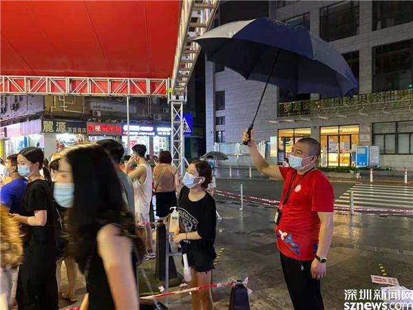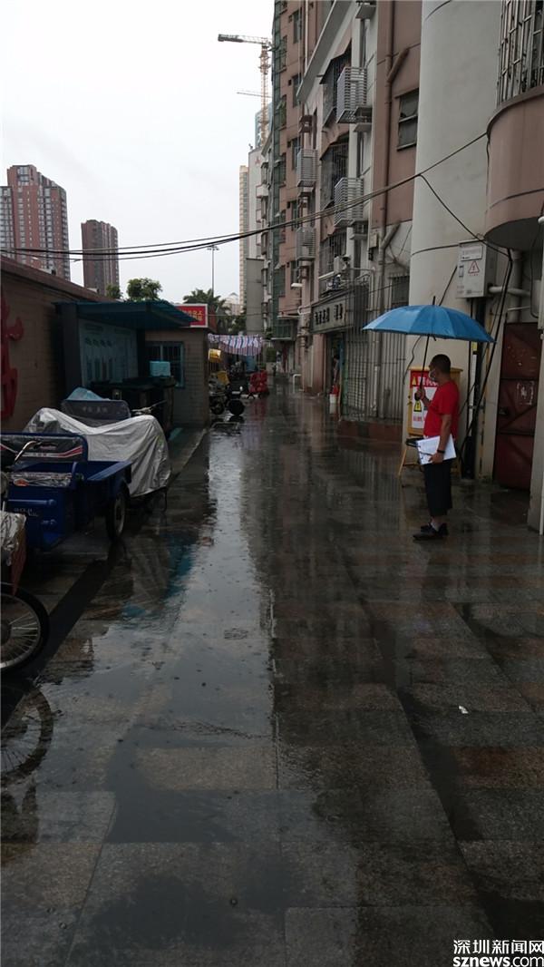 桂園街道防疫一線工作人員冒著高溫和大雨,全力保障轄區(qū)居民生命健康安全 。
