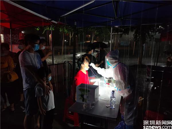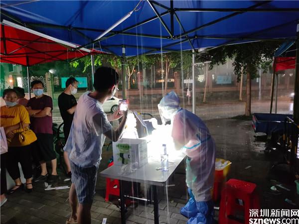 長嶺村市民文化廣場醫(yī)務(wù)人員在雨中為居民進(jìn)行核酸檢測 。