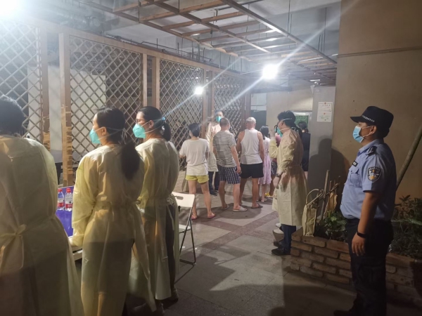 “我們已經(jīng)協(xié)調(diào)社康開始發(fā)號了,不要急,請耐心等待。”筍崗社康外,一名民警正頂著烈日揮汗如雨,耐心地給居民進(jìn)行解釋,警服肩頸處可見一道道汗?jié)n。