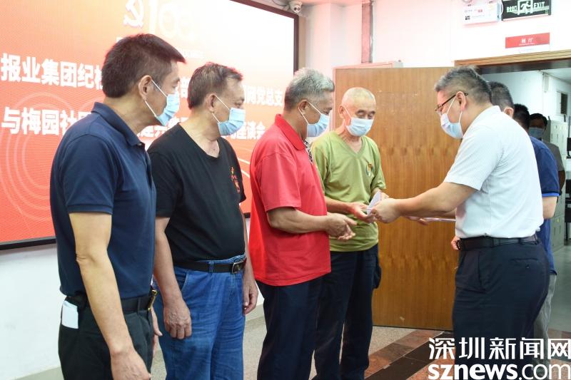 黨課結(jié)束后,陳鵬等代表深圳報(bào)業(yè)集團(tuán)一行對(duì)社區(qū)老黨員進(jìn)行慰問(wèn),并向老黨員代表送上慰問(wèn)金和禮包,隨后,陳鵬向梅園社區(qū)“光榮在黨50年”老黨員們頒發(fā)紀(jì)念章,“你們辛苦了,我們要向你們學(xué)習(xí),希望你們注意身體,繼續(xù)為社區(qū)做貢獻(xiàn)。”陳鵬捧起紀(jì)念章,為老黨員們戴上,并對(duì)老黨員們送上關(guān)心和祝福。
