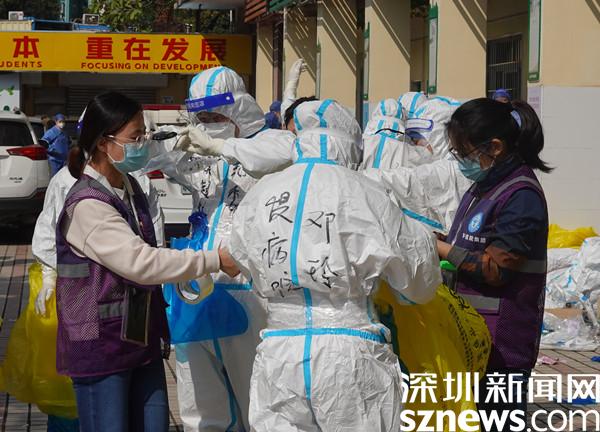 臘八節(jié)剛過,深圳帶著些許涼意,卻也是艷陽高照?!巴緜?,相互檢查一下手腕腳腕有沒有貼好!穿戴整齊后準(zhǔn)備集結(jié)出發(fā)啦!”在封控區(qū)外圍的醫(yī)護(hù)人員整備區(qū),一群身穿防護(hù)服、全副“武”裝的工作人員整裝待發(fā),兩人一組,目光堅(jiān)定,向著封控區(qū)的入口走去。