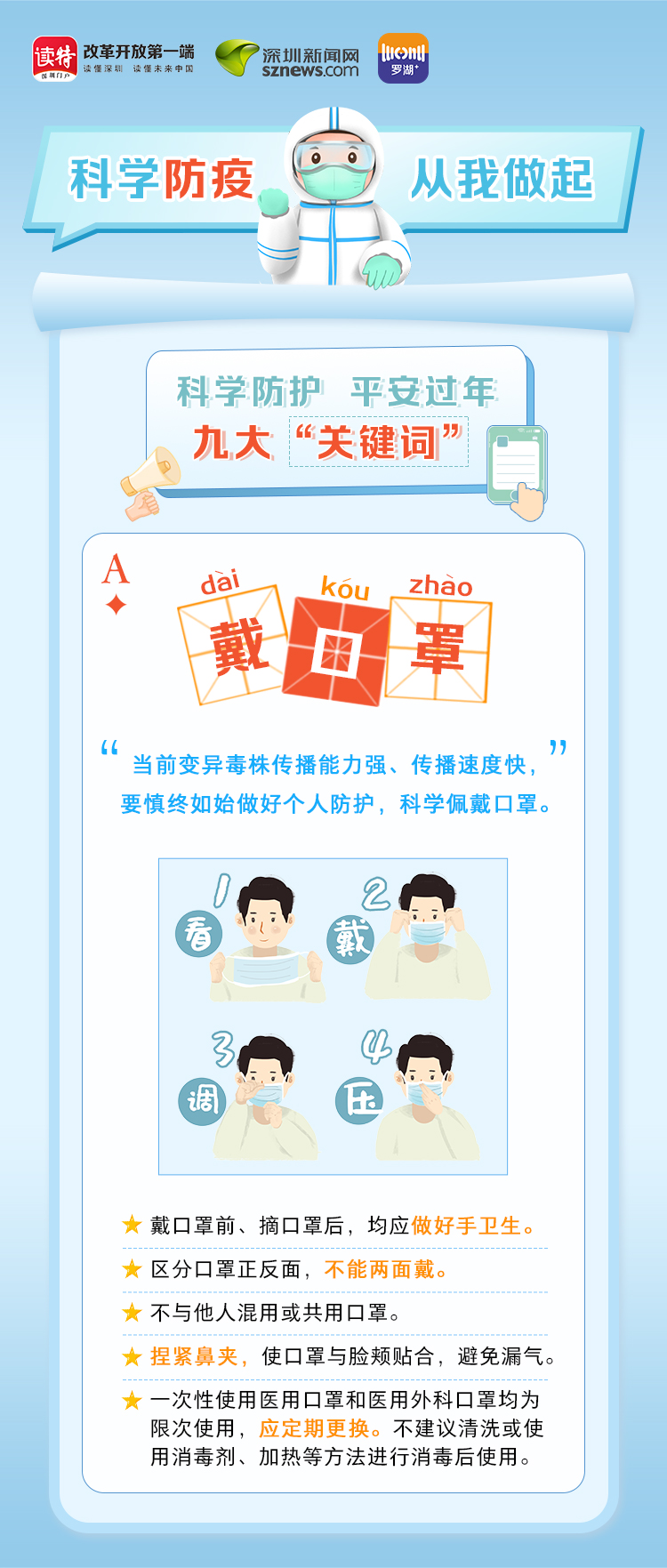 為更好地保護(hù)自己和他人的健康,度過一個祥和平安的春節(jié),請查收《科學(xué)防護(hù)平安過年九大“關(guān)鍵詞”》。在這場沒有硝煙的戰(zhàn)斗中,公安干警、醫(yī)護(hù)人員、社區(qū)工作者、志愿者始終堅(jiān)守在一線,齊心協(xié)力、眾志成城抗擊疫情。讓我們攜手并進(jìn),共同抗疫,采用科學(xué)有效的方式做好自身防護(hù),不僅對自己負(fù)責(zé),更是對家人負(fù)責(zé),對社會負(fù)責(zé)。
