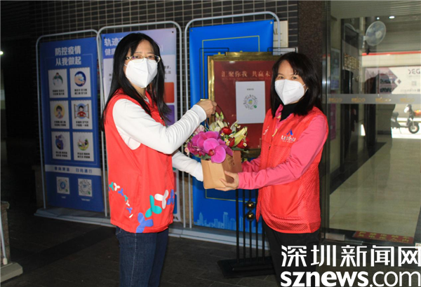 在老圍花園C2卡口,老圍社區(qū)黨委書記、婦聯(lián)主席許少瓊將花籃送到堅(jiān)守在這里的居民義工陳艷芳手中,感謝她對(duì)社區(qū)疫情防控的支持。一直以來,陳艷芳只要有空就到社區(qū)做義工,核酸檢測點(diǎn)、小區(qū)卡口都是她的戰(zhàn)場,查驗(yàn)綠碼、場所碼、督促戴口罩,測體溫,早已游刃有余,是名副其實(shí)的抗疫女戰(zhàn)士。她接過花籃,對(duì)許少瓊說,“其實(shí)社區(qū)工作人員更辛苦。”