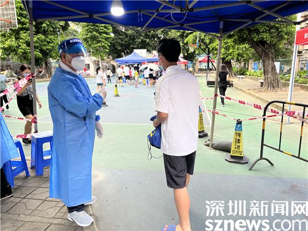 每到下午4點,羅湖區(qū)翠竹街道龍屋小區(qū)的籃球場上,都有陸陸續(xù)續(xù)迎來做核酸的居民,而李任平,則會提前半個小時到達現(xiàn)場準備,每日如此,風雨無阻。穿上防護服,戴上防護面罩,將“翠竹街道退役軍人”的臂章戴上,鮮紅的黨員徽章別在胸前,李任平就開始站在核酸檢測點卡口前,指引做核酸的居民掃碼、亮碼,維持秩序。