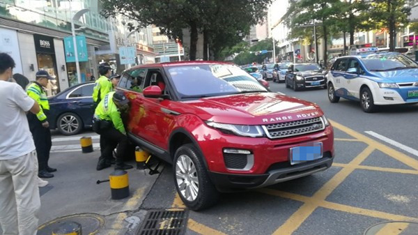 10月3日16時40分左右,正在羅湖區(qū)金光華路段開展整治行動的交警遇到一名女士求助,稱車子卡在停車場出口的石墩上。