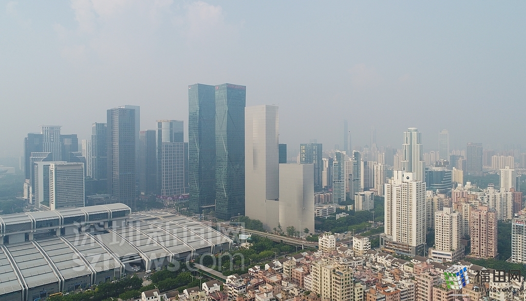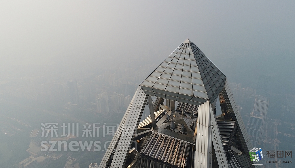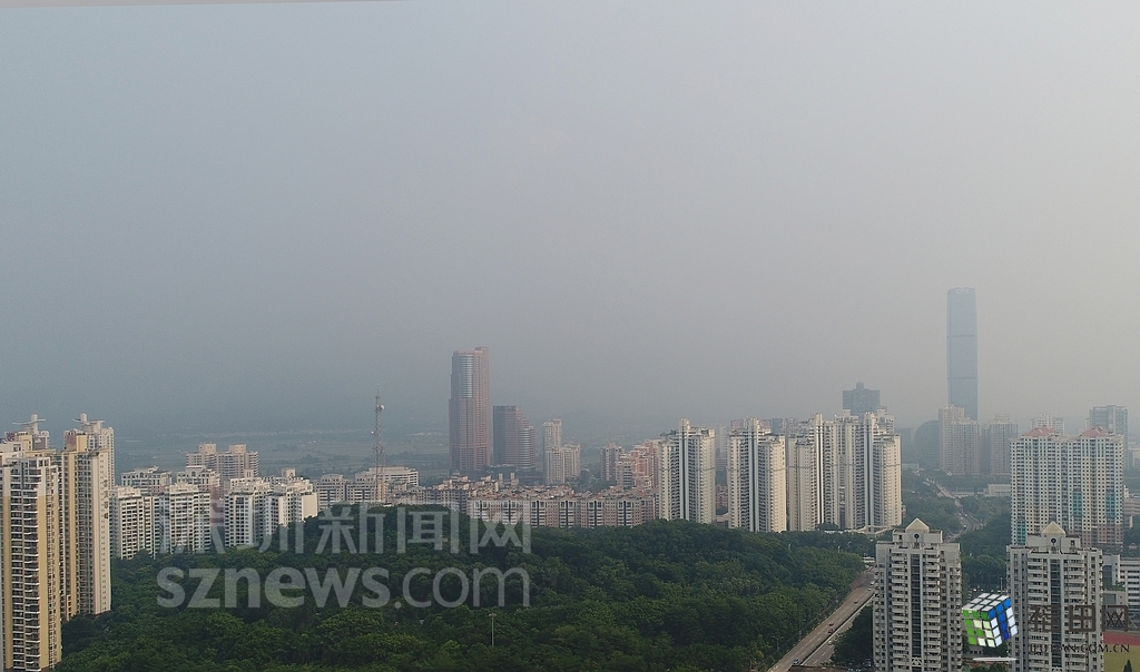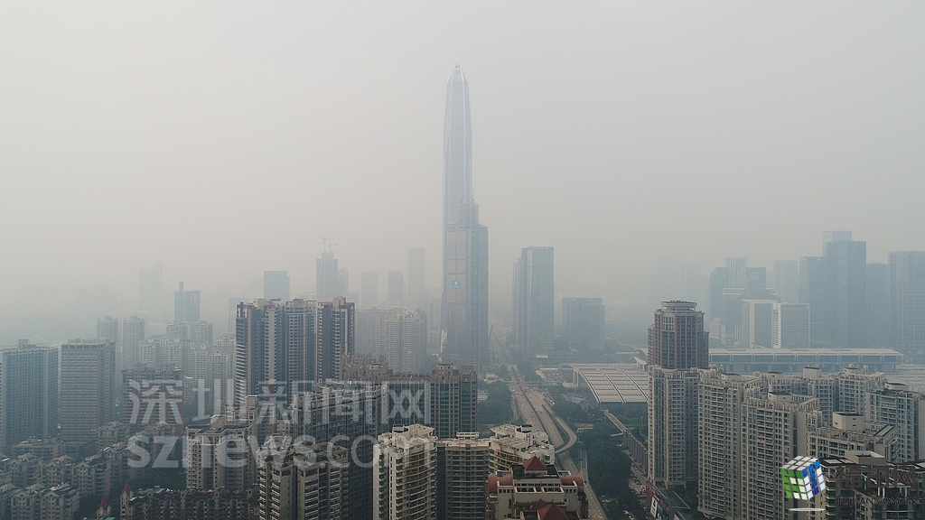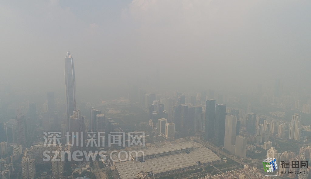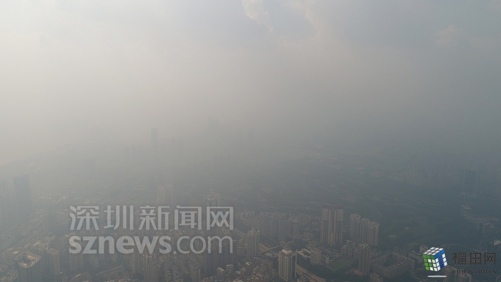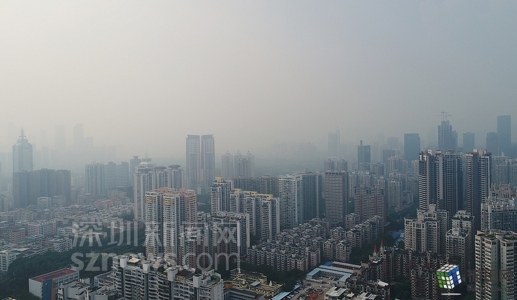 無人機在數(shù)百米高空俯瞰灰霾籠罩下的深圳中心區(qū),大半個城區(qū)都看不清楚。