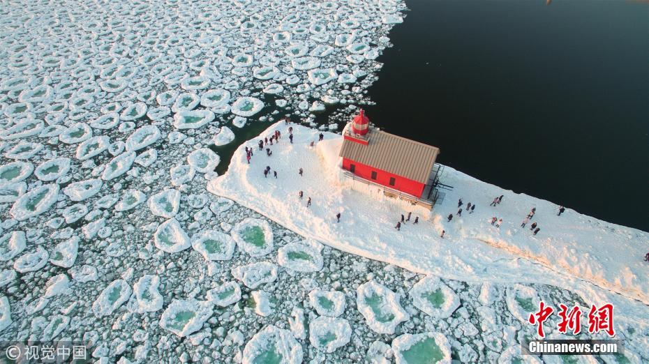 2018年1月30日,由于連日低溫,美國密歇根湖出現(xiàn)了滿湖的巨大圓形冰塊,高處俯瞰像極了荷葉,它們完全覆蓋了四分之一英里的密歇根湖,甚是壯觀。圖片來源:視覺中國