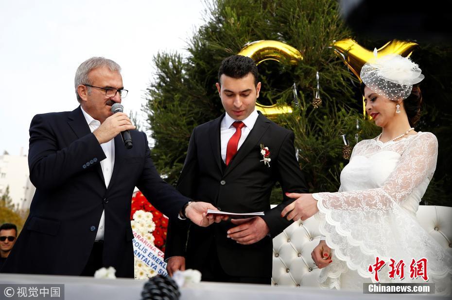 當(dāng)?shù)貢r(shí)間2018年3月21日,土耳其安塔利亞,警官Ceren Ekici和Taha YasinGul舉行婚禮。在10個(gè)月前的一次行動(dòng)中,Taha YasinGul不慎開槍擊中Ceren Ekici的頭部,所幸沒有造成生命危險(xiǎn)。他們的婚禮由警局同事操辦,同事們舉著防彈盾牌,護(hù)送這對新人走向禮臺。圖片來源:視覺中國