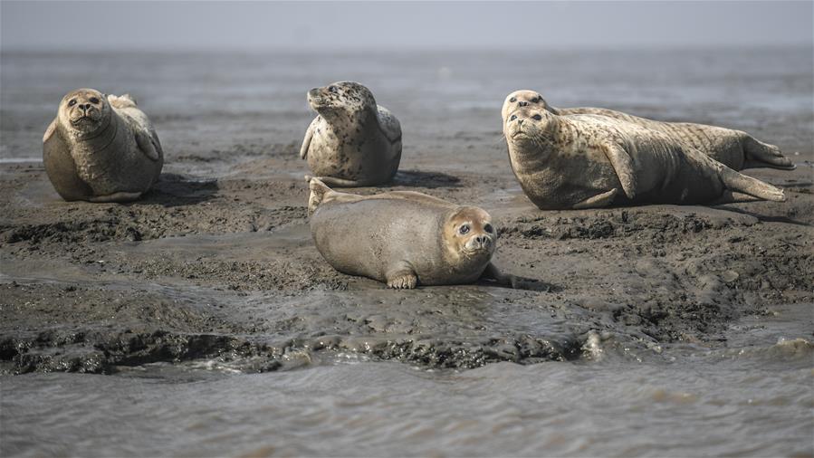 3月25日,一群斑海豹在遼寧盤錦雙臺河口三道溝海域的灘涂上休息。新華社記者潘昱龍攝