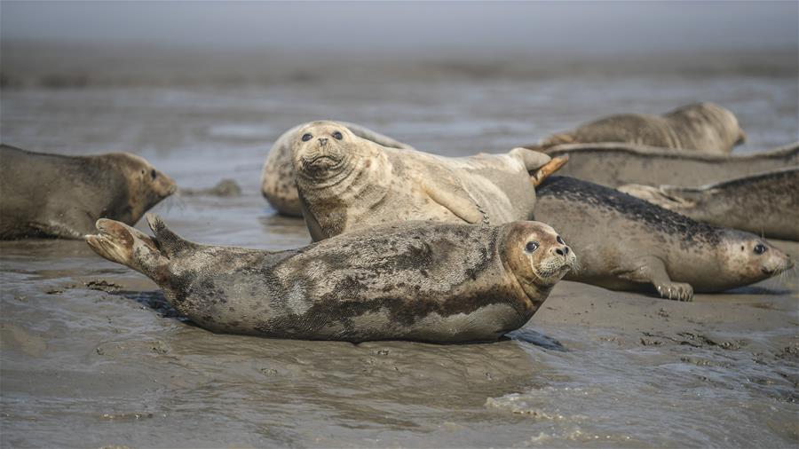 3月25日,一群斑海豹在遼寧盤(pán)錦雙臺(tái)河口三道溝海域的灘涂上休息。新華社記者潘昱龍攝