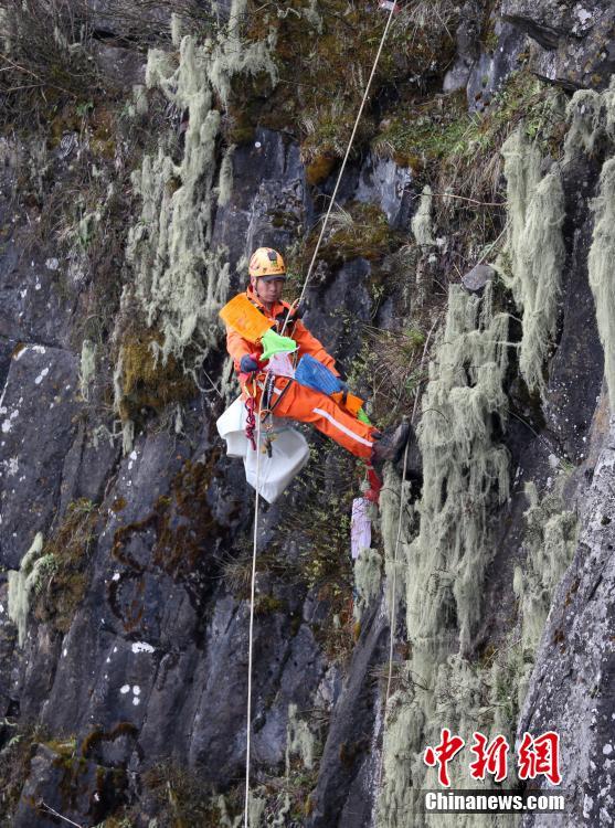5月1日,四川峨眉山,樂山山地救援隊(duì)隊(duì)長(zhǎng)王麒正在清理峨眉山金頂崖壁上的垃圾。中新社記者 劉忠俊 攝