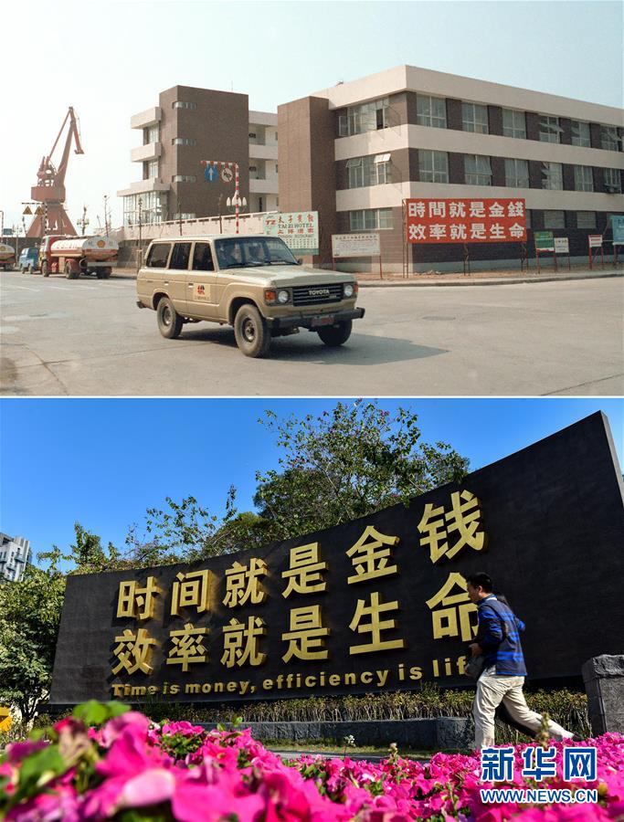 拼版照片:上圖為深圳蛇口工業(yè)區(qū)辦公大廈(資料照片,新華社記者徐佑珠攝);下圖為2015年2月24日,一名男子走過深圳蛇口時(shí)間廣場(chǎng)的“時(shí)間就是金錢,效率就是生命”牌(新華社記者毛思倩攝)。新華社發(fā)
