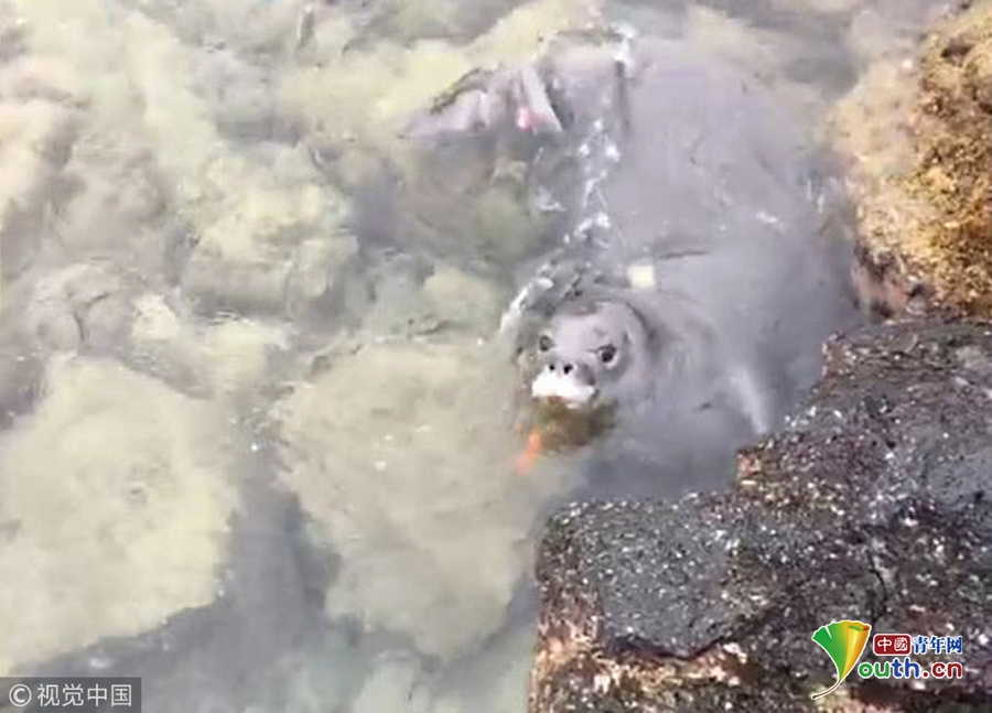 自然資源部的發(fā)言人稱它在近岸的巖石下發(fā)現(xiàn)了這個(gè)橙色小刀。一位工作人員說他很擔(dān)心小海豹會吞下刀,他還提醒我們要妥善處理垃圾,不要隨意丟棄在海灘上或者海里。