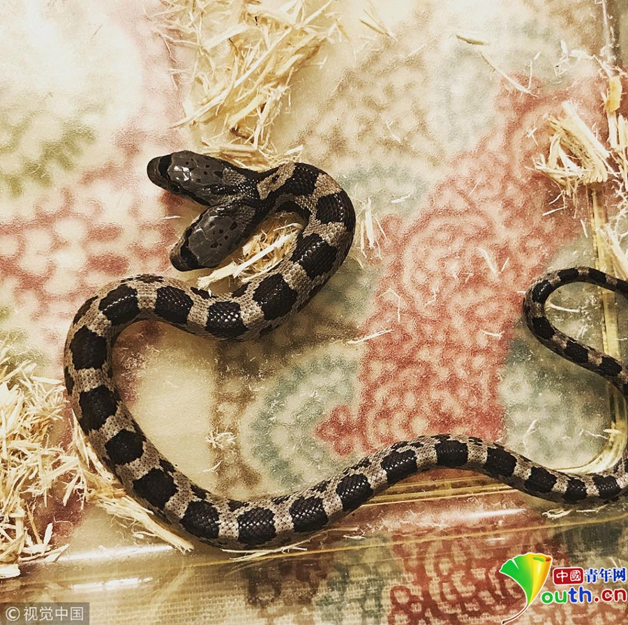 6月6日消息,在美國(guó)路易斯安那州新奧爾良,野生動(dòng)物專家Tanee Janusz收養(yǎng)了同事在后院發(fā)現(xiàn)的一只雙頭錦蛇。據(jù)報(bào)道,該雙頭蛇由于基因缺陷而擁有兩只頭,概率僅有萬(wàn)分之一,Tanee Janusz為兩只蛇頭分別起了名字,這對(duì)“雙胞胎”擁有不同的性格,經(jīng)常因?yàn)橥淖吲ぷ饕粓F(tuán)。 圖片來(lái)源:視覺(jué)中國(guó)