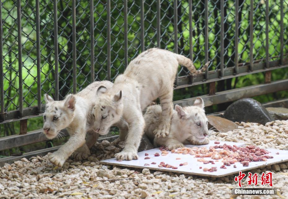 7月10日,雪虎五胞胎分享“肉餡蛋糕”。當日,濟南野生動物世界五胞胎雪虎誕生滿百日,正式與游客見面。中新社記者 張勇攝