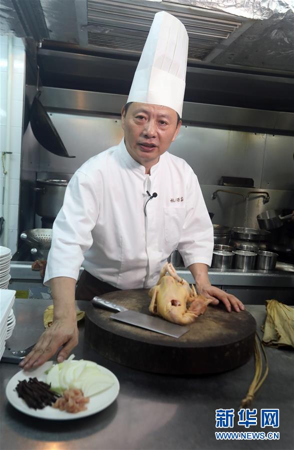 杭州酒家老板吳瑞康向記者介紹“叫化雞”的制作工序(6月16日攝)。 金庸在武俠小說《神雕俠侶》中借郭靖之口說過: “為國為民,俠之大者?!蔽鋫b精神在香港備受推崇,有其心向中華文化的情感基礎。在這個國際美食之都,品味舌尖上的武俠味,內中的感覺別有深意。新華社記者 李鵬 攝