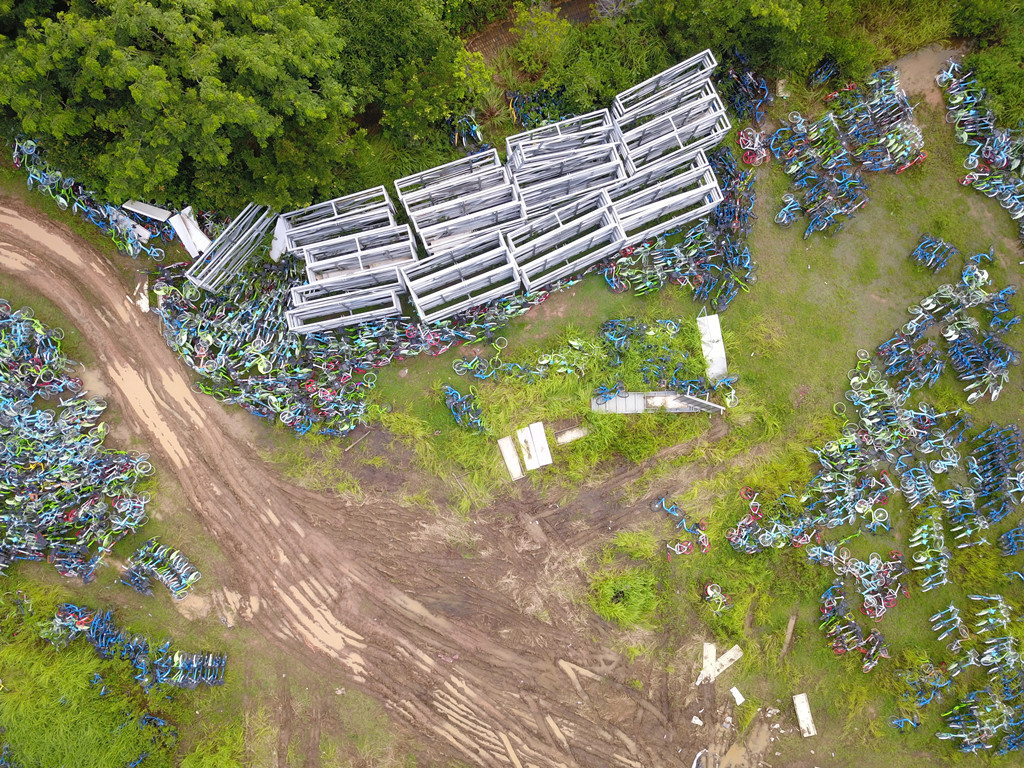 從高空中能夠看到,堆放的單車大多為目前無法正常運(yùn)營的酷騎、小藍(lán)單車