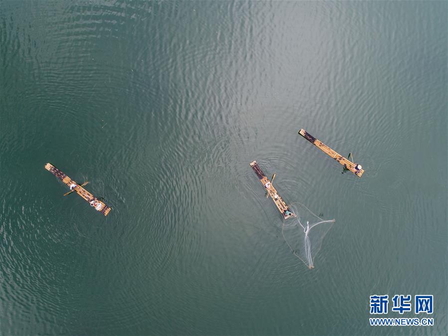 8月1日,淳安縣汾口鎮(zhèn)紅星村的漁民乘著竹排,在千島湖的支流武強(qiáng)溪上進(jìn)行撒網(wǎng)捕撈作業(yè)(無(wú)人機(jī)拍攝)。新華社記者 徐昱攝