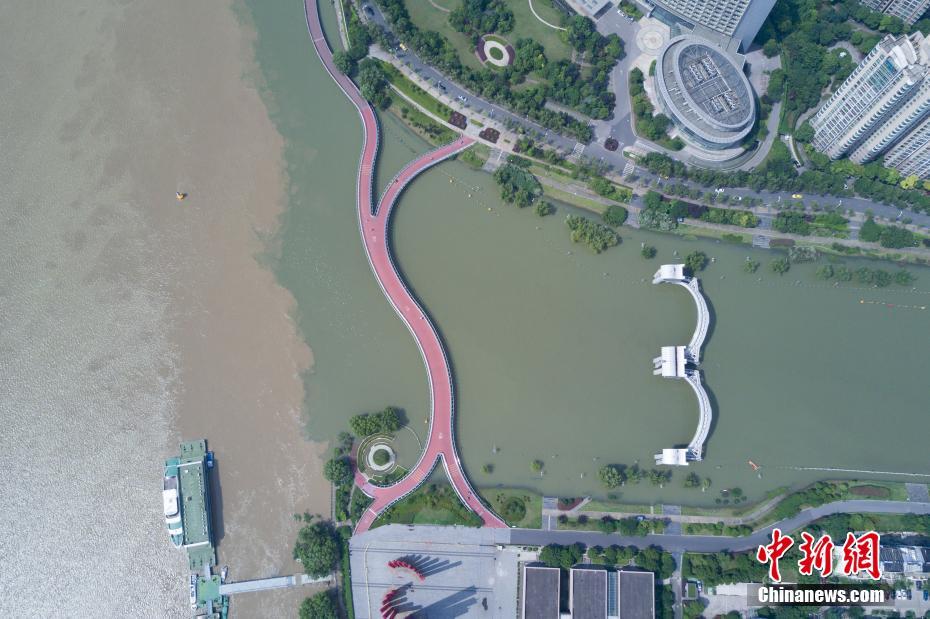 7月10日,航拍長(zhǎng)江與南京秦淮河交匯處,江水與河水“涇渭分明”。當(dāng)日,江蘇水利廳發(fā)布的水情信息顯示,長(zhǎng)江南京段水位已降至警戒線以下。中新社記者泱波 攝