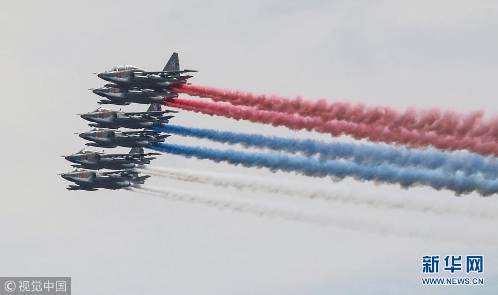 當(dāng)?shù)貢r(shí)間2018年8月4日,俄羅斯梁贊,2018“航空飛鏢”國(guó)際軍事比賽即將開幕,特技飛行隊(duì)在彩排。(圖片來源:視覺中國(guó))