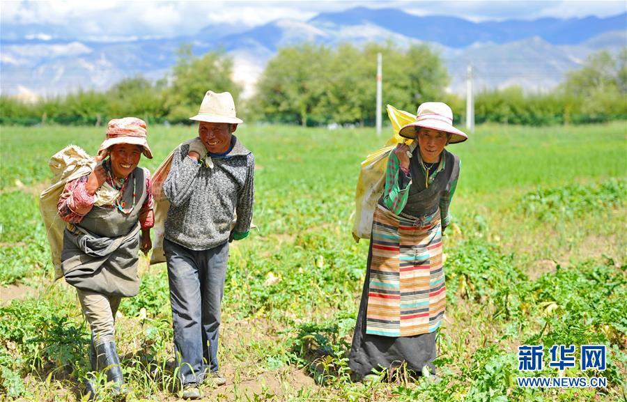 8月8日,在邊雄鄉(xiāng)普夏村蘿卜種植基地,村民將收獲的蘿卜運(yùn)向地頭。 新華社發(fā)(趙宏 攝)