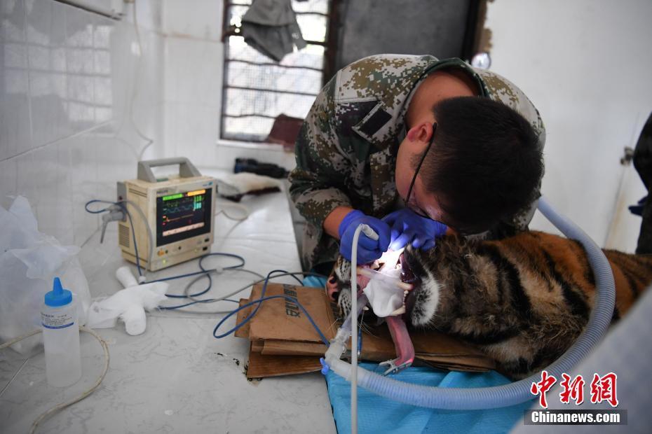 8月9日,獸醫(yī)為老虎洗牙,旁邊有心電監(jiān)護(hù)儀隨時監(jiān)測老虎身體狀況。當(dāng)日,位于昆明的云南野生動物園獸醫(yī)通過呼吸麻醉的方式,為園中一只一歲的老虎清潔牙。中新社記者 劉冉陽 攝