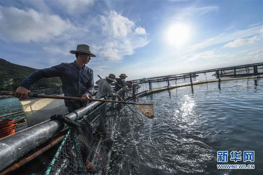8月18日,南麂島海域的“海上牧場(chǎng)”養(yǎng)殖區(qū)內(nèi),漁民正捕撈大黃魚,處于仿生養(yǎng)殖環(huán)境的大黃魚需要生長(zhǎng)2至3年。進(jìn)入8月,浙江省溫州市平陽縣南麂鎮(zhèn)海域上大片的大黃魚、貽貝等特色海產(chǎn)品養(yǎng)殖區(qū)域迎來豐收季節(jié),養(yǎng)殖戶們駕駛漁船在養(yǎng)殖區(qū)海域進(jìn)行打撈收獲,在碧海藍(lán)天下構(gòu)成了一幅“海上牧場(chǎng)”的美麗豐收景象。近年來,南麂鎮(zhèn)政府引導(dǎo)漁民養(yǎng)殖戶充分發(fā)揮“靠海吃?!钡馁Y源優(yōu)勢(shì),大力發(fā)展海洋養(yǎng)殖經(jīng)濟(jì)和海島旅游經(jīng)濟(jì),實(shí)現(xiàn)了南麂由“生態(tài)美”向“產(chǎn)業(yè)美”,“產(chǎn)業(yè)美”向“經(jīng)濟(jì)美”的轉(zhuǎn)變。同時(shí)該鎮(zhèn)堅(jiān)持以大黃魚、貽貝等為特色產(chǎn)業(yè)支撐,精準(zhǔn)發(fā)展高效海洋養(yǎng)殖業(yè),重點(diǎn)培養(yǎng)一批新型職業(yè)漁民,依靠專業(yè)技術(shù)支持,實(shí)現(xiàn)深海仿生養(yǎng)殖,讓好生態(tài)造就好品質(zhì),重點(diǎn)打造南麂養(yǎng)殖品牌,組建營銷網(wǎng)絡(luò),拓展特色海產(chǎn)品市場(chǎng)。新華社記者 徐昱攝