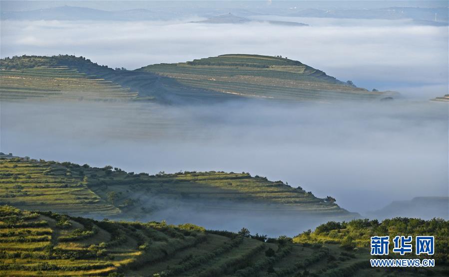 云霧繚繞的寧夏彭陽(yáng)縣金雞坪梯田公園(7月17日攝)。新華社記者 王鵬 攝