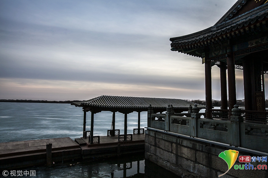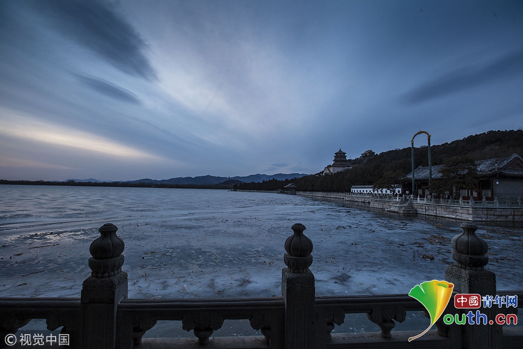 2018年2月23日,北京頤和園。當天日落時分昆明湖上空出現夕陽余暉的美景,夢幻般的色彩將古老的皇家園林裝扮得美輪美奐,讓人流連忘返。來源:視覺中國