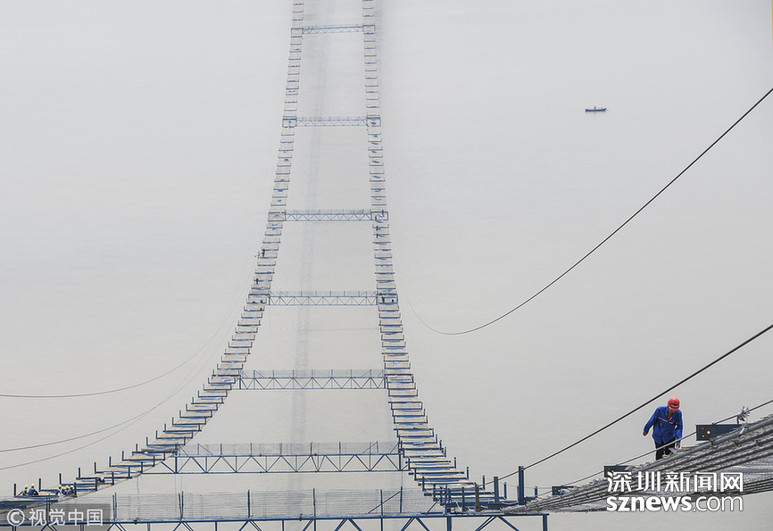 14日11時(shí)許,記者在228.8米高空建設(shè)現(xiàn)場(chǎng)感受到,高空風(fēng)力在6級(jí)上下,中跨、邊跨施工便道現(xiàn)場(chǎng)一片忙碌景象:班組長(zhǎng)雷承易帶著10余名工人或在用扳手錨緊貓道面網(wǎng)的扶手繩,或在鋪設(shè)鐵絲防護(hù)網(wǎng)……