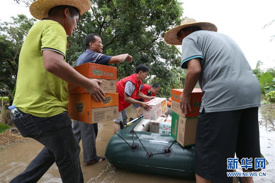 9月18日,在廣東省陽江市陽春市,人們把食物搬運(yùn)到筏子上,準(zhǔn)備分發(fā)給受困村民。  新華社記者張加揚(yáng)攝