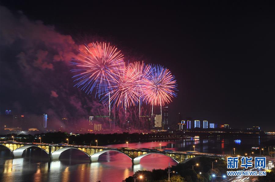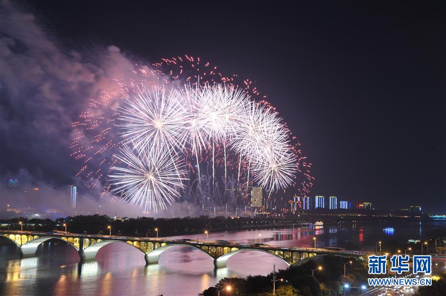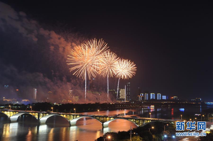 9月19日晚,湖南省長沙市在湘江橘子洲舉辦焰火晚會,絢麗的焰火與湘江兩岸的城市夜景交相輝映。