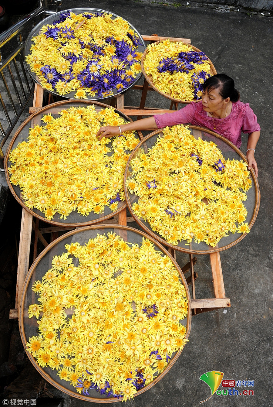 2018年9月23日,廣西柳州,柳北區(qū)石碑坪鎮(zhèn)下陶村的農民覃向鮮在晾曬九品香蓮。圖片作者:陳健明