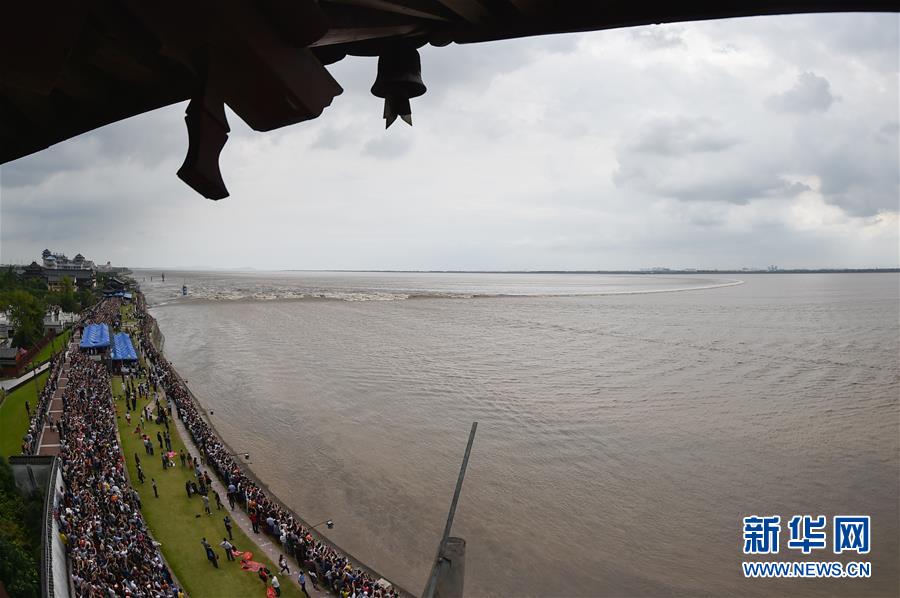 9月27日在浙江海寧市鹽官鎮(zhèn)占鰲塔上拍攝的錢塘江“一線潮”。當(dāng)日是農(nóng)歷八月十八,號稱“天下第一潮”的錢塘江大潮洶涌而來,眾多錢塘江沿岸居民和游客爭睹其壯觀景象。新華社記者 黃宗治 攝