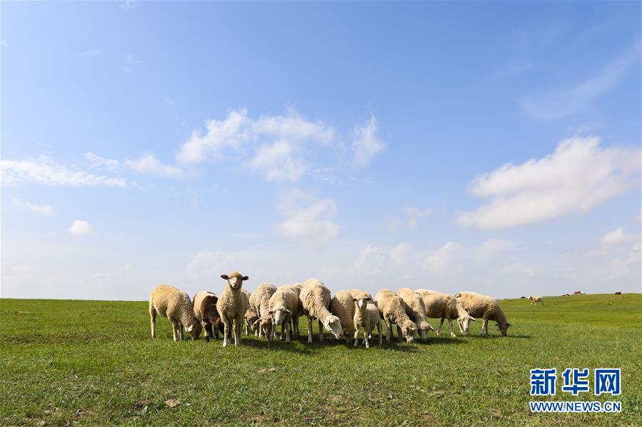 羊群在錫林郭勒盟正藍(lán)旗的草原上覓食(7月16日攝)。盛夏時節(jié),內(nèi)蒙古錫林郭勒草原一碧千里,遙接天際。藍(lán)天白云之下,牛羊悠閑自在,馬群奔馳其中,風(fēng)光旖旎。 新華社記者 劉磊 攝