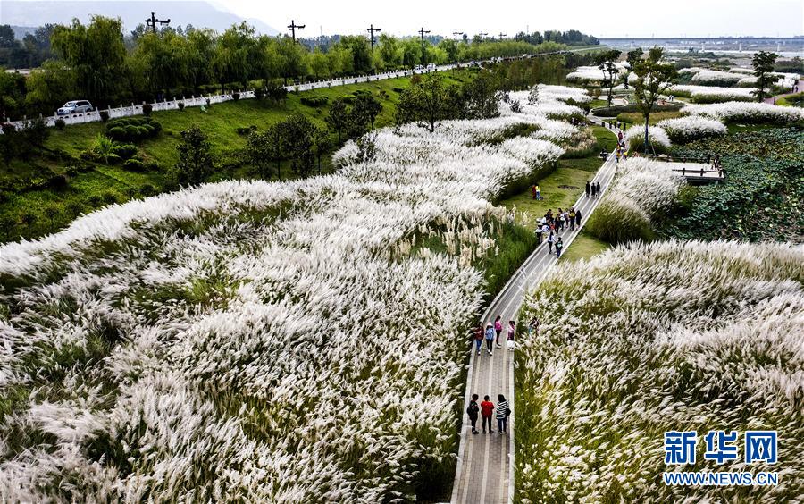 9月28日,人們在蘆花盛開的漢江濕地公園里游覽(無人機拍攝)。新華社記者陶明 攝