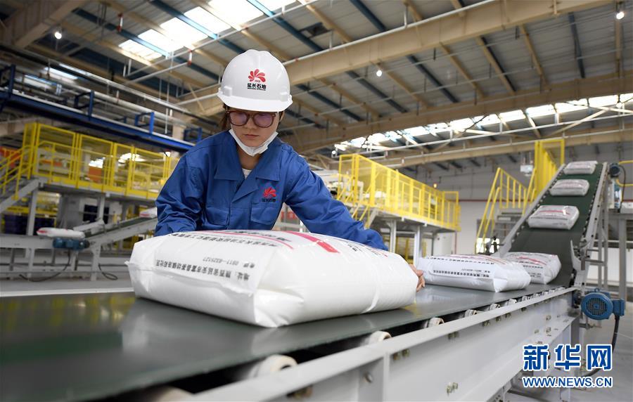 延安煤油氣資源綜合利用項(xiàng)目包裝車間的工作人員進(jìn)行產(chǎn)品包裝檢查(9月28日攝)。新華社記者劉瀟攝