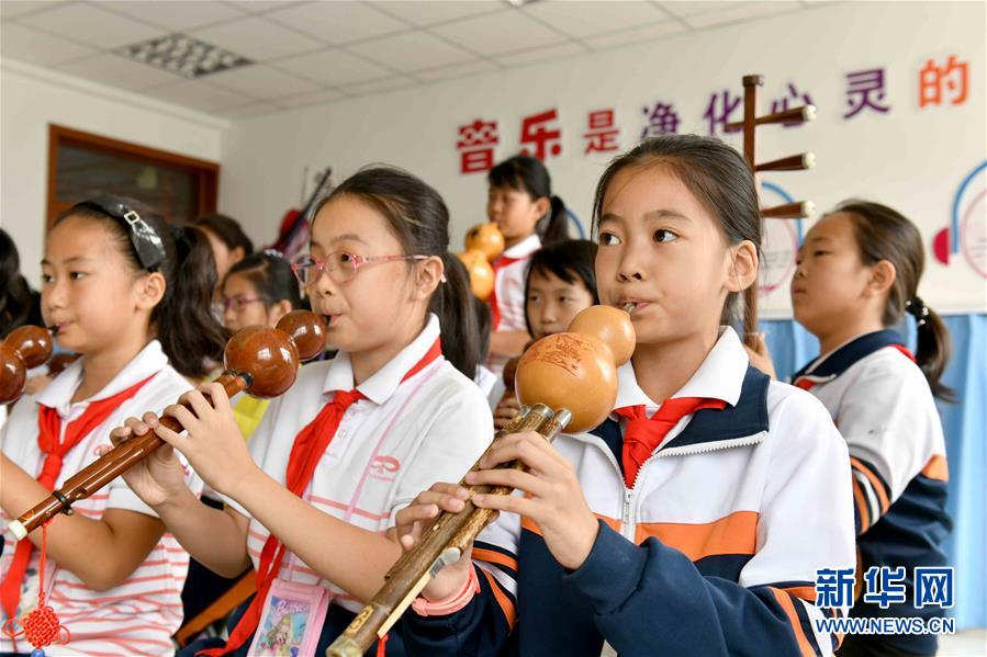 9月29日,在威海市經(jīng)濟(jì)技術(shù)開(kāi)發(fā)區(qū)新都小學(xué),學(xué)生們吹奏葫蘆絲。新華社記者郭緒雷攝