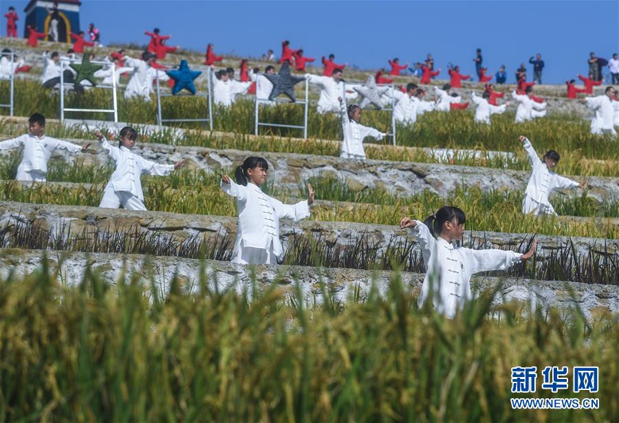 9月29日,太極拳愛好者在建德市大洋鎮(zhèn)高垣村的千畝梯田上進(jìn)行表演。當(dāng)日,2000多名太極拳愛好者在浙江省建德市大洋鎮(zhèn)高垣村的千畝梯田上參加太極拳表演,吸引很多當(dāng)?shù)厝撕陀慰颓皝碛^賞,助力當(dāng)?shù)亟鹎飼r(shí)節(jié)鄉(xiāng)村旅游。近兩年來,大洋鎮(zhèn)充分利用土地整治后形成的千畝梯田打造農(nóng)業(yè)觀光綜合體,發(fā)展綜合型農(nóng)業(yè)觀光旅游,為鄉(xiāng)村振興注入新活力。新華社記者徐昱攝
