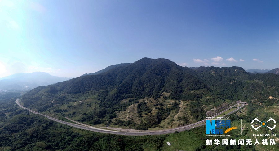 拼接照片:這是廈蓉高速南靖縣建安隧道(右)外的長(zhǎng)下坡路段。改擴(kuò)建工程竣工之后,長(zhǎng)下坡將改成上行線,變?yōu)樯掀侣范危o(wú)人機(jī)拍攝)。新華網(wǎng) 肖和勇 攝