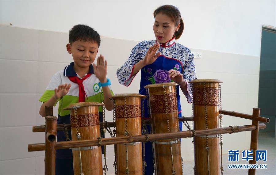 10月8日,崇義縣竹樂(lè)樂(lè)團(tuán)的演員在教學(xué)生演奏竹板鈴。 近年來(lái),江西省崇義縣思源實(shí)驗(yàn)學(xué)校定期開(kāi)設(shè)竹樂(lè)課,邀請(qǐng)崇義縣竹樂(lè)樂(lè)團(tuán)的演員教授學(xué)生演奏竹排琴、竹板琴等竹樂(lè)樂(lè)器,激發(fā)學(xué)生了解傳統(tǒng)文化的熱情。 新華社記者胡晨歡攝