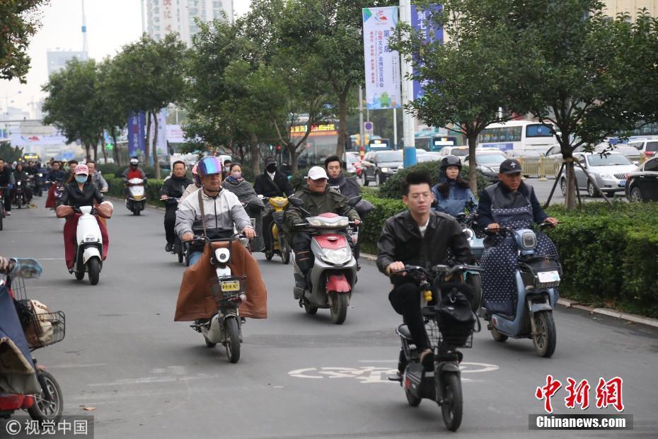 2018年10月9日,山東濟(jì)南,昨日一場(chǎng)秋雨過(guò)后開(kāi)始降溫,今天清晨最低氣溫只有6度,馬路上不少上班族穿上羽絨服騎車趕上班路。 圖片來(lái)源:視覺(jué)中國(guó)