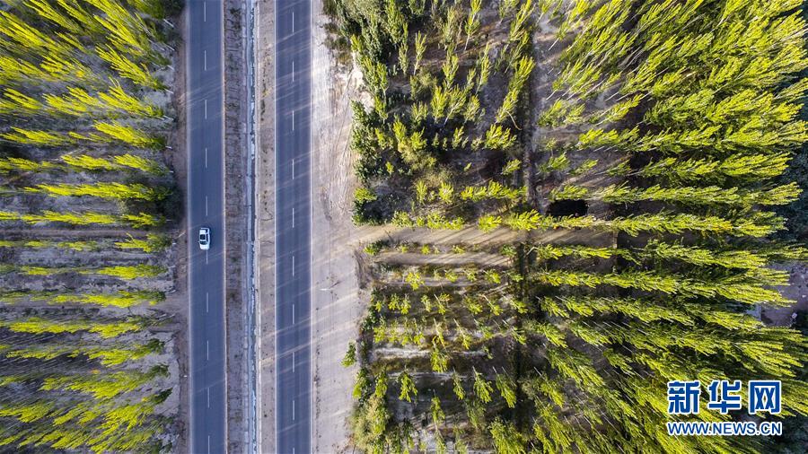 車輛行駛在新疆阿克蘇地區(qū)柯柯牙綠化工程核心區(qū)(9月20日無人機拍攝)。 在世界第二大流動性沙漠——塔克拉瑪干沙漠西北邊,一條逾百萬畝的人工林帶傲然挺立。 這條林帶就是柯柯牙荒漠綠化工程。它是新疆阿克蘇黃沙漫漫和碧波萬頃的分界嶺。 1986年,為改變惡劣的自然條件,阿克蘇啟動柯柯牙綠化工程。30年間,各族干部群眾攜手奮斗,曾是沙塵暴策源地的柯柯牙綠樹成蔭;并以此為原點,在南疆戈壁荒灘上孕育出百萬畝的“綠?!薄?30多年來,阿克蘇打造出“人走政不息”的樣本,使綠色發(fā)展理念成為幾代人的廣泛共識;“自力更生、艱苦奮斗、無私奉獻”的柯柯牙精神,已融入各族兒女血液中;“以林養(yǎng)林”“邊綠化邊脫貧”的綠化、脫貧方式,給其他荒漠地區(qū)貢獻了“柯柯牙智慧”。 新華社記者 胡虎虎 攝