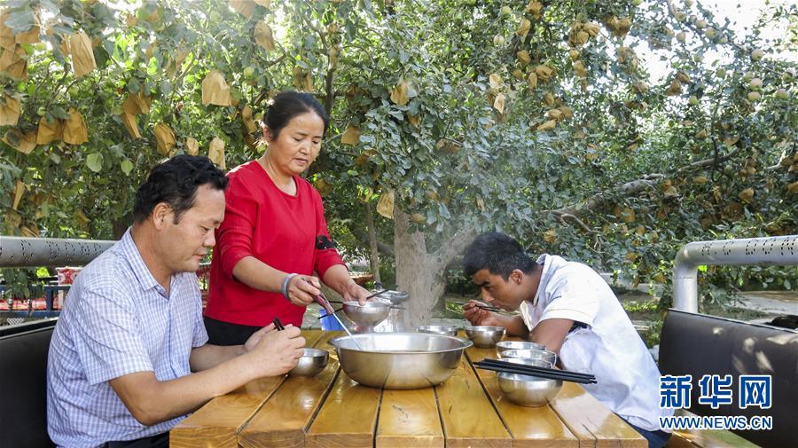 甘永軍(左一)在地處新疆阿克蘇地區(qū)柯柯牙綠化工程內(nèi)的果園吃飯(2017年9月22日攝)。10年前,甘永軍還在果園開起了第一個農(nóng)家樂,帶動周邊100多戶果農(nóng)經(jīng)營起了自家庭院。 在世界第二大流動性沙漠——塔克拉瑪干沙漠西北邊,一條逾百萬畝的人工林帶傲然挺立。 這條林帶就是柯柯牙荒漠綠化工程。它是新疆阿克蘇黃沙漫漫和碧波萬頃的分界嶺。 1986年,為改變惡劣的自然條件,阿克蘇啟動柯柯牙綠化工程。30年間,各族干部群眾攜手奮斗,曾是沙塵暴策源地的柯柯牙綠樹成蔭;并以此為原點,在南疆戈壁荒灘上孕育出百萬畝的“綠?!薄?30多年來,阿克蘇打造出“人走政不息”的樣本,使綠色發(fā)展理念成為幾代人的廣泛共識;“自力更生、艱苦奮斗、無私奉獻”的柯柯牙精神,已融入各族兒女血液中;“以林養(yǎng)林”“邊綠化邊脫貧”的綠化、脫貧方式,給其他荒漠地區(qū)貢獻了“柯柯牙智慧”。 新華社記者 杜剛 攝