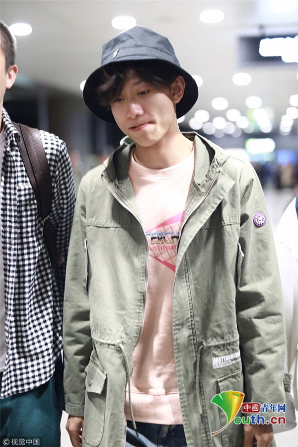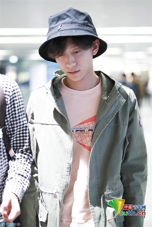 2018年10月14日,上海,張一山抵達上海機場。張一山戴漁夫帽眼袋嚴(yán)重瞬間老十歲, 用手擋臉?biāo)撇辉干乡R。