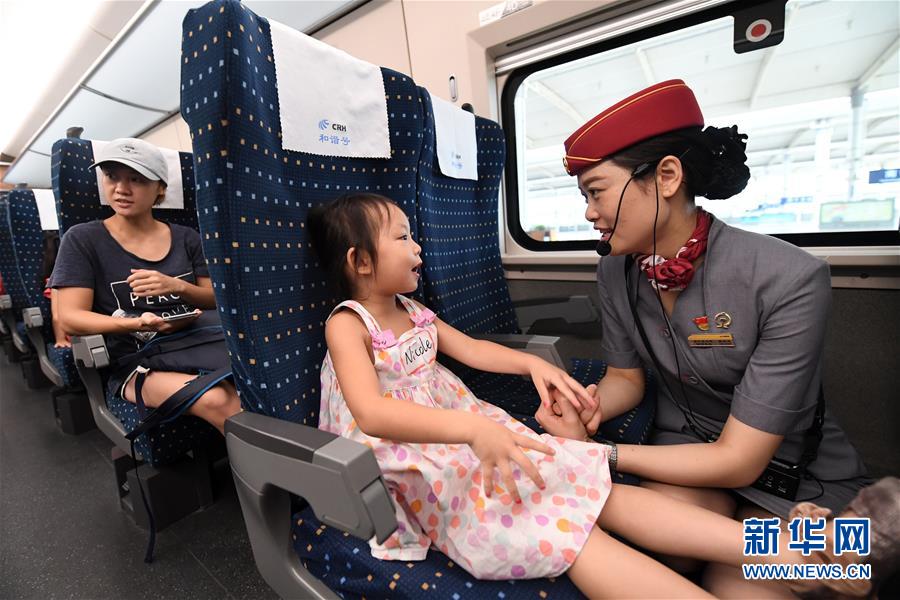 在南寧東站,一名列車工作人員在和一名小朋友交流(2017年8月5日攝)。 廣西壯族自治區(qū)成立60年來,鐵路建設(shè)發(fā)生翻天覆地的變化。來自中國鐵路南寧局集團有限公司的數(shù)據(jù)顯示,1958年廣西鐵路總里程為1346.3公里,如今廣西鐵路總里程達5191公里。廣西與周邊相鄰省份間實現(xiàn)動車“公交化”開行。此外,北部灣港—重慶班列、東盟海產(chǎn)品冷鏈班列、“百色一號”果蔬專列等的開通和運營,強化了鐵路供給的針對性和有效性。鐵路成為助推廣西經(jīng)濟社會快速發(fā)展的“大動脈”。 新華社記者陸波岸攝