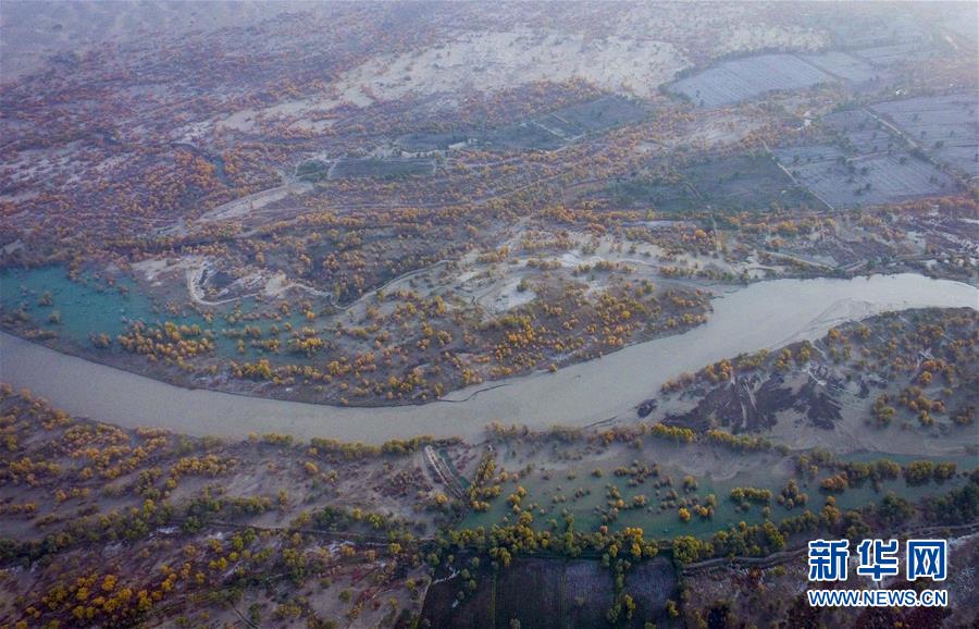 這是10月16日拍攝的從空中俯瞰新疆尉犁縣的胡楊(無人機拍攝)。 新華社記者 趙戈 攝