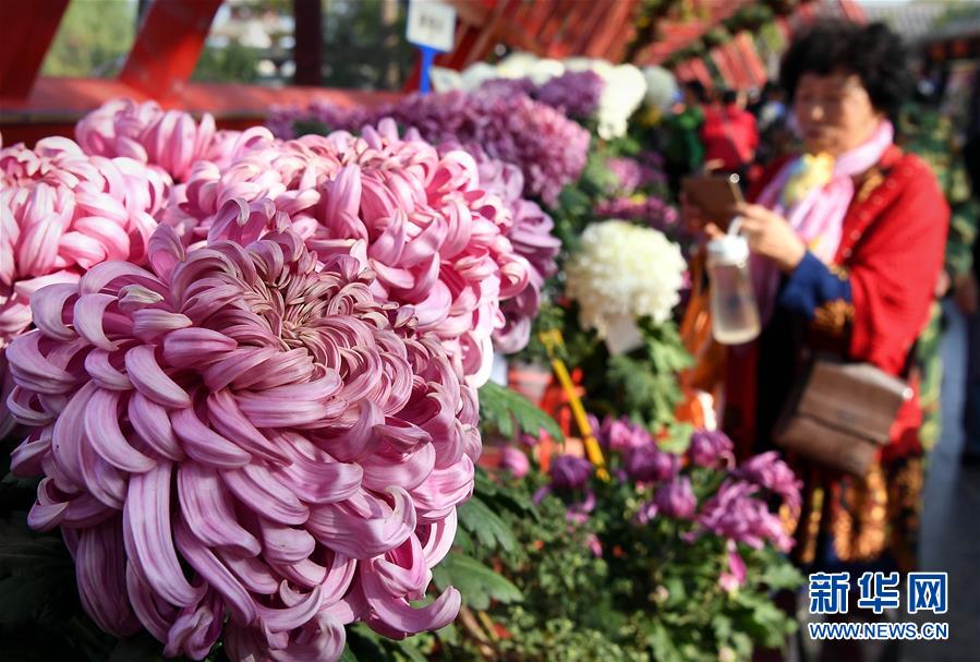 10月17日,游客在開封龍亭公園內(nèi)拍攝展出的菊花。重陽時節(jié),各色菊花競相綻放,把古都開封裝點得分外秀美,吸引眾多游客前來觀賞游玩。 新華社記者 李安 攝